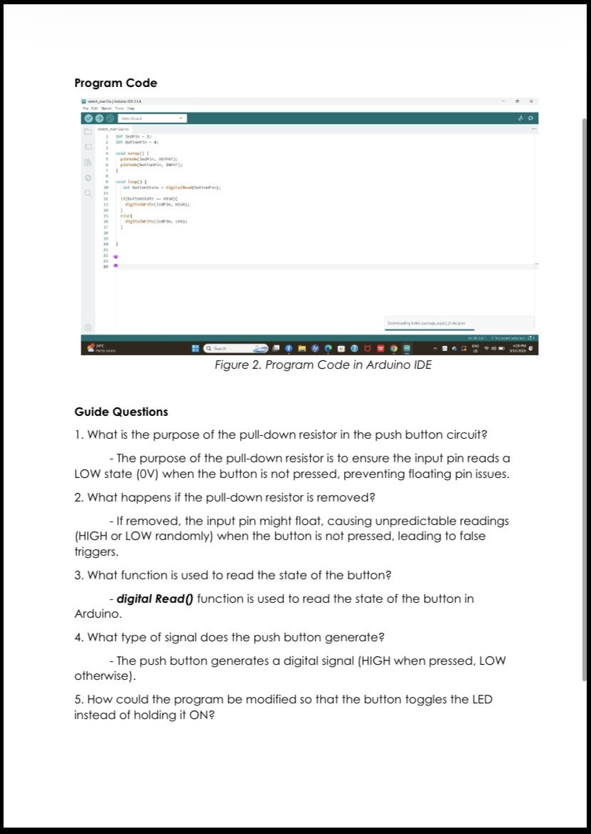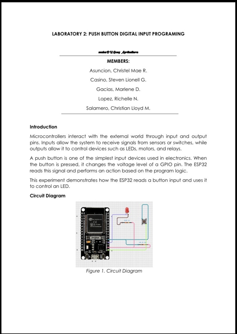 In this laboratory exercise, students learned how to read a digital signal from a push button and use it to control an LED using the ESP32 development board.