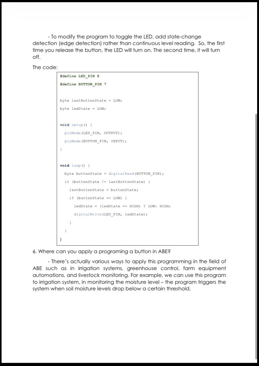 5. How could the program be modified so that the button toggles the LED instead of holding it ON?