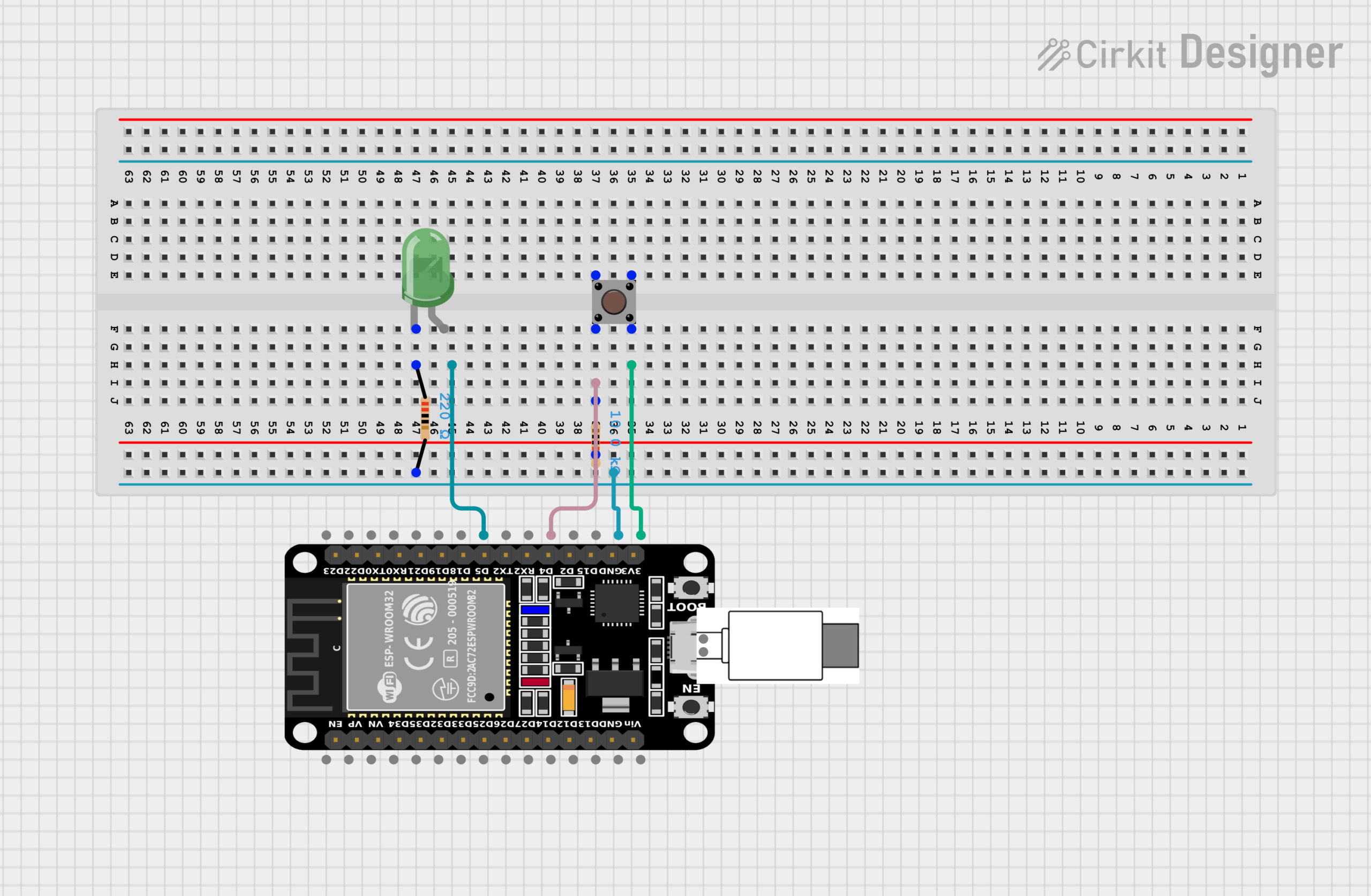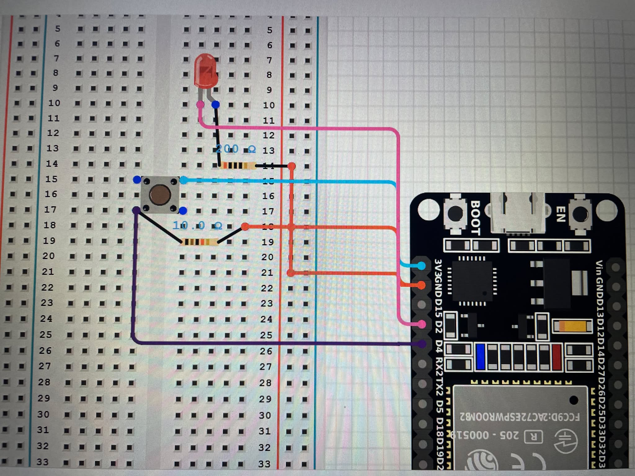 – Since it is the component which connects the push button to the circuit and the ESP32, the circuit will not work and there will be no connection between the LED light on whether it will light up or not when the button is pressed.
