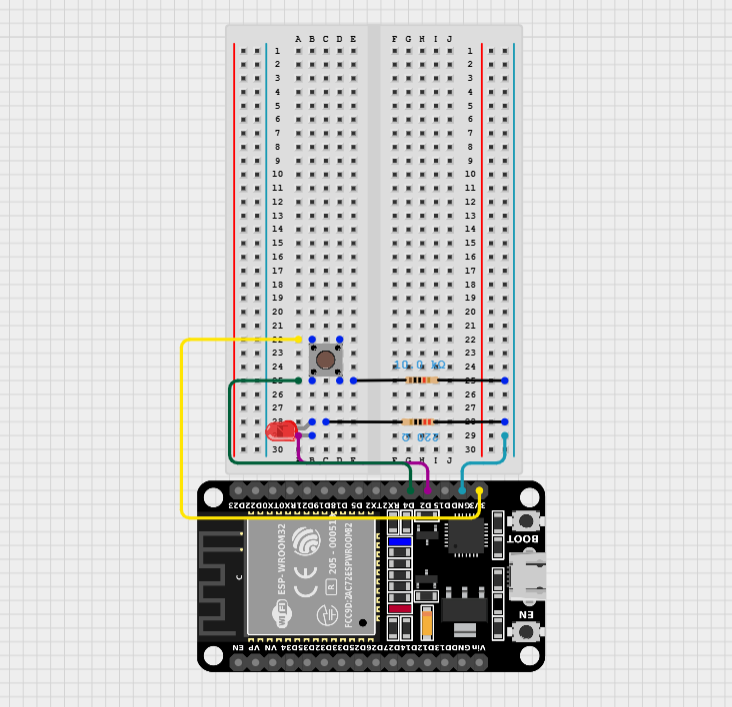 – A pull-down resistor ensures that the microcontroller pin stays at LOW (0V) when the button is not being pressed. When the ESP32 detects a HIGH(3.3V) signal from the button, the program will turn the LED ON.