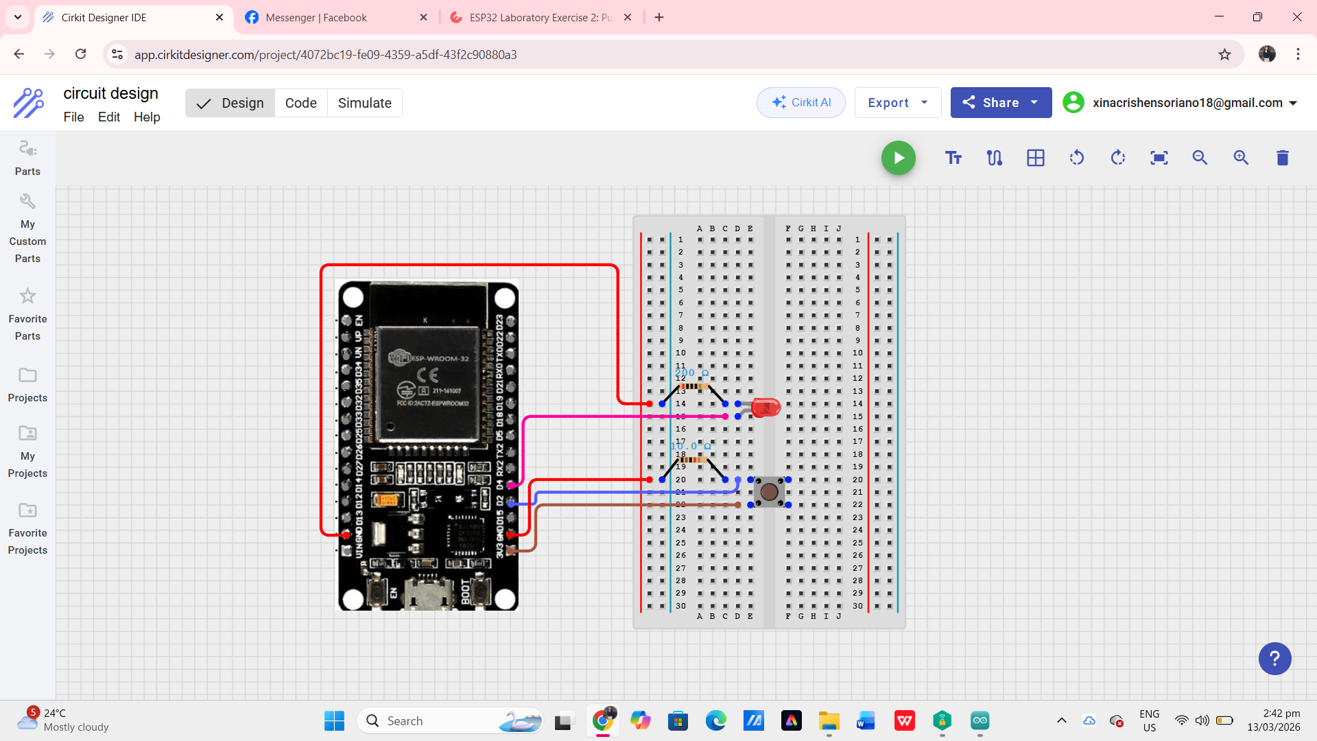 Connect the LED and push button to the ESP32 using a breadboard according to the circuit diagram.